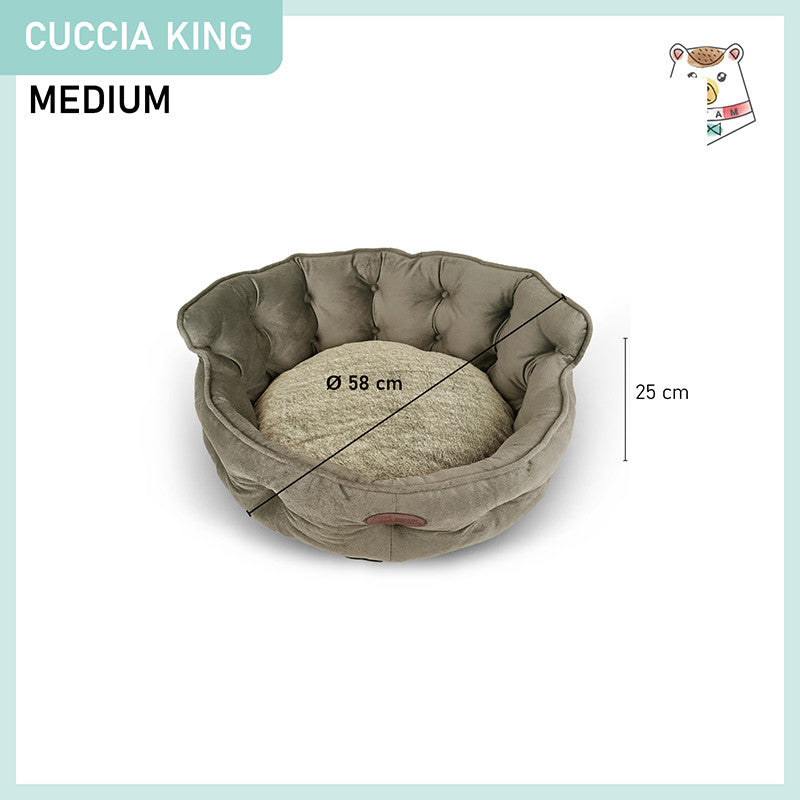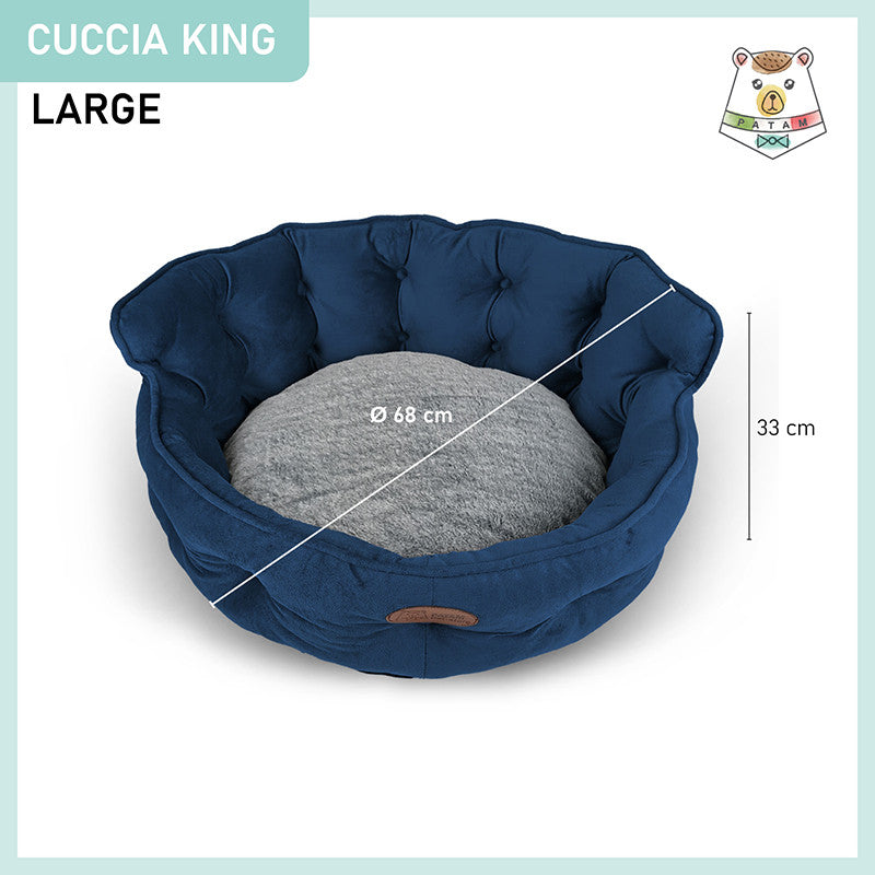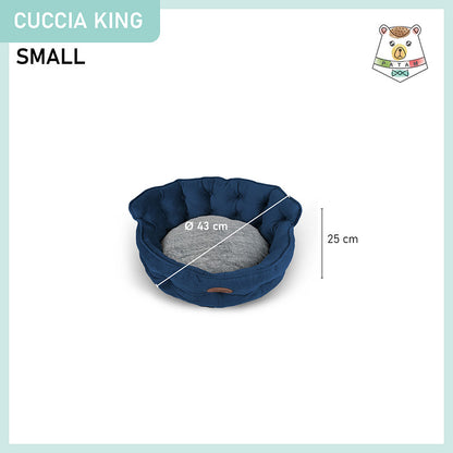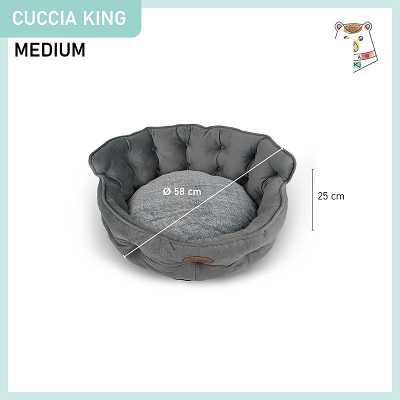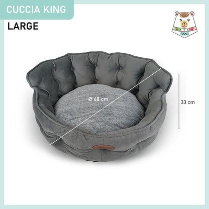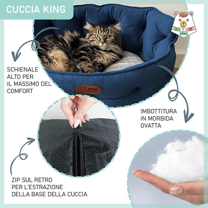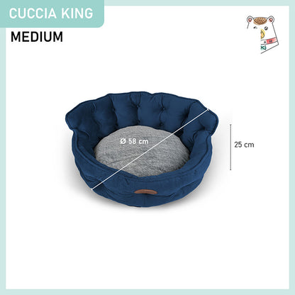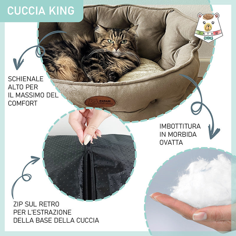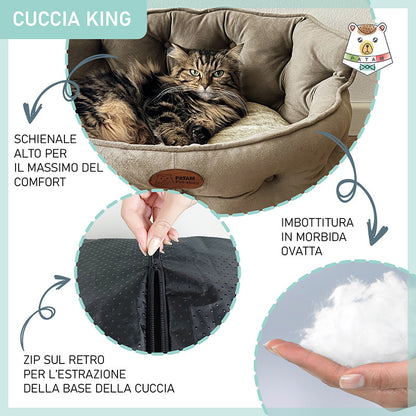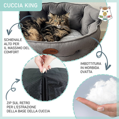Cuccia per cani e gatti King. Divanetto sagomato con ingresso ribassato e schienale imbottito disponibile in 3 dimensioni per animali di ogni taglia.