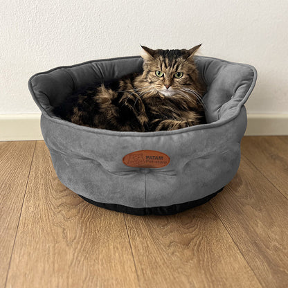 Il lettino King è dotato di fondo antiscivolo e presenta una zip che permette di estrarre l’imbottitura centrale, in modo da poter lavare l’intera cuccia comodamente in lavatrice a 30°. Lo schienale esterno è realizzato con un morbido tessuto effetto velluto, mentre la base è rivestita con un tessuto effetto peluche.