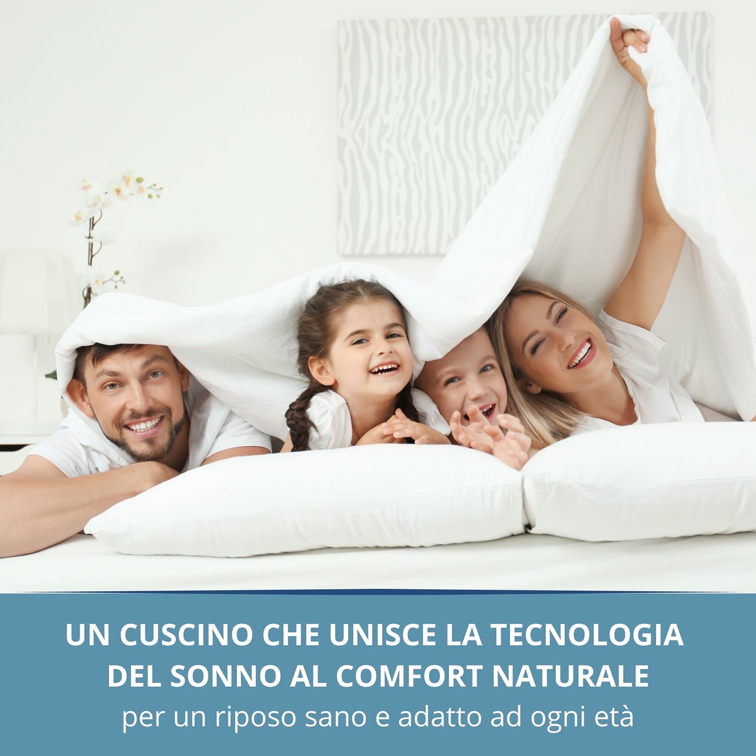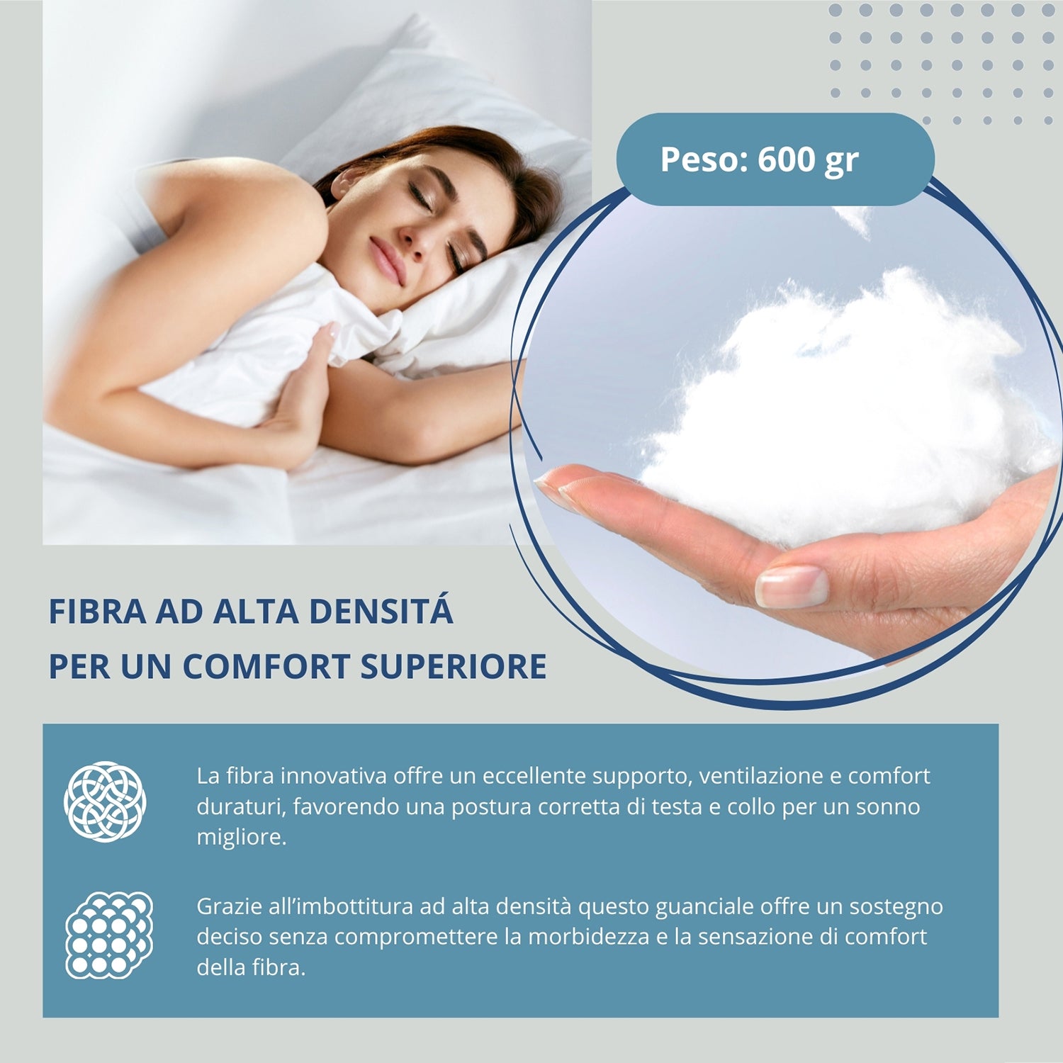 Disponibile in due grammature, il cuscino da 900 grammi offre una tenuta più decisa e compatta, ideale per chi cerca maggiore sostegno, mentre la variante da 600 grammi garantisce una morbidezza avvolgente e un comfort più delicato. Entrambe le versioni sono traspiranti, anallergiche e antiacaro.
