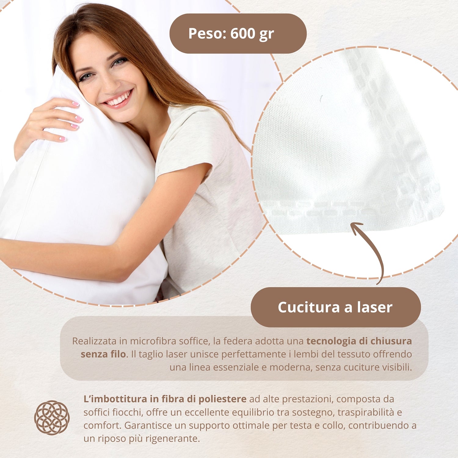 La tecnologia di cucitura laser senza filo rende i guanciali più resistenti e durevoli nel tempo, garantendo una forma stabile e una finitura elegante. Questi cuscini sono traspiranti, anallergici e certificati Oeko-Tex Standard 100, per offrire sicurezza e qualità in ogni dettaglio.