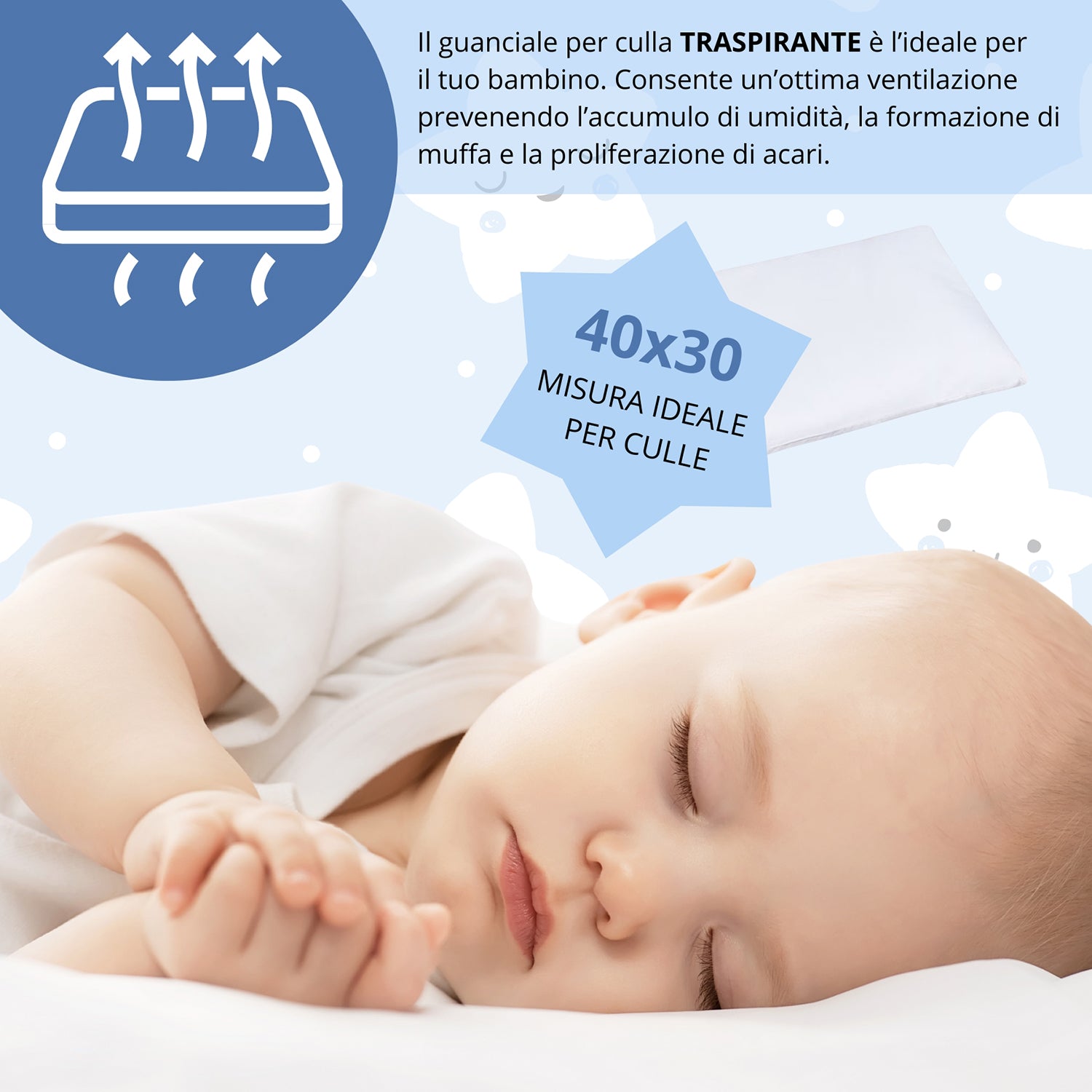 Il cuscino Banzaii per culla e lettino è studiato per garantire il massimo comfort e la sicurezza del bambino durante il sonno. Realizzato con federa in 100% cotone traspirante e imbottitura in fibra di poliestere anallergica e antiacaro, offre morbidezza, igiene e una ventilazione ottimale, mantenendo il riposo sempre asciutto e confortevole.