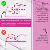 La sua forma a doppia onda con due diverse altezze (H10 e H12 cm) permette di scegliere il lato più adatto alle proprie esigenze. La curvatura ergonomica favorisce il corretto allineamento di testa, collo e spalle, migliorando la respirazione e aiutando a prevenire dolori muscolari o rigidità. Un design pensato per adattarsi perfettamente a ogni posizione di riposo, sia supina che laterale.