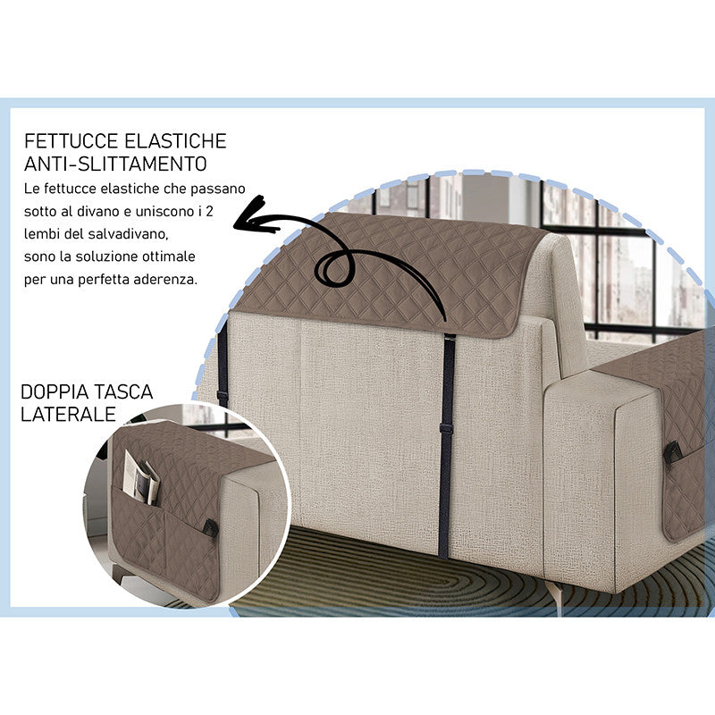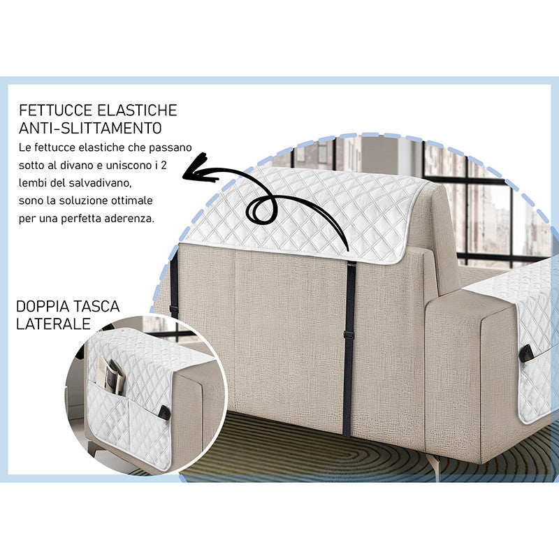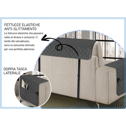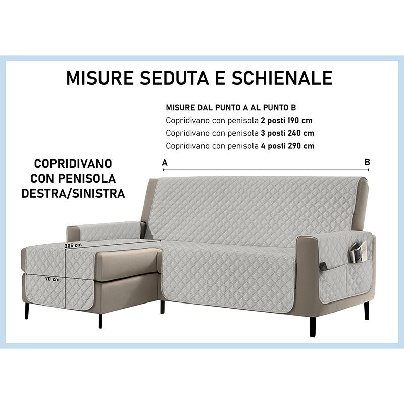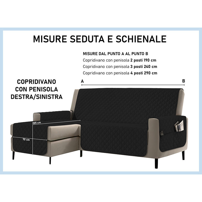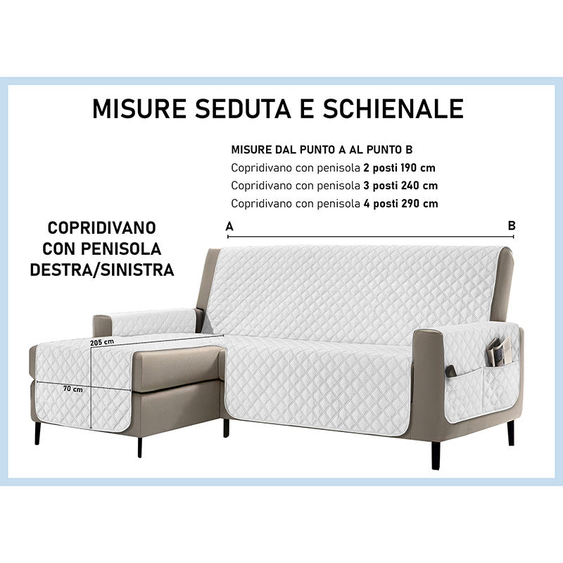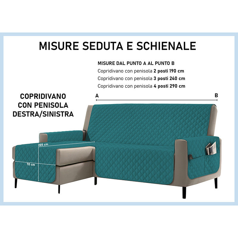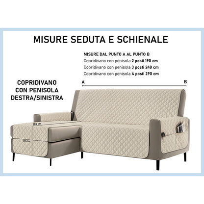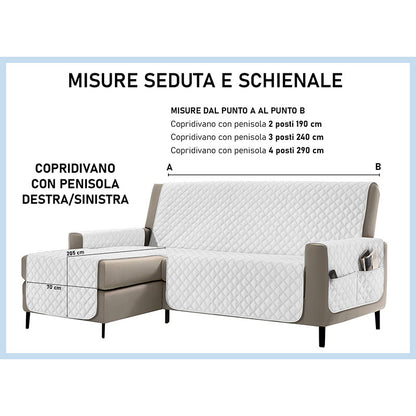 Copridivano con penisola impermeabile, salvadivano antimacchia, trapuntato, reversibile con tasche porta oggetti