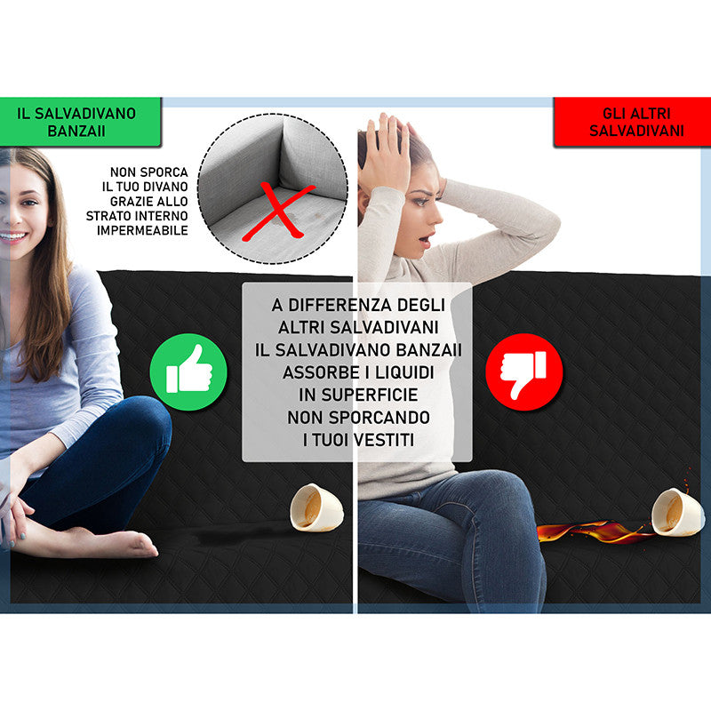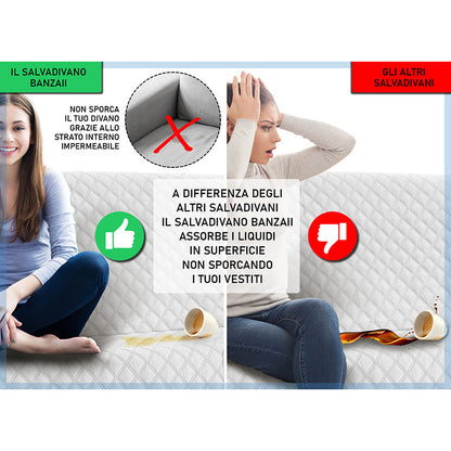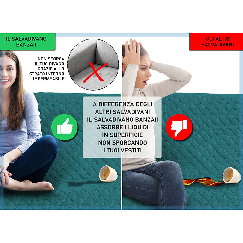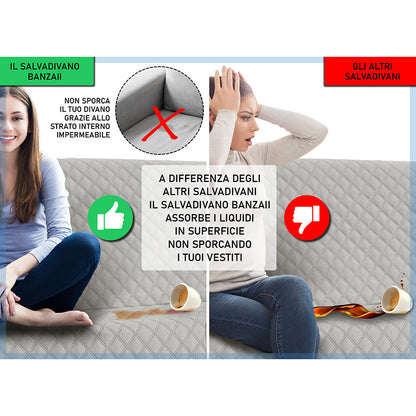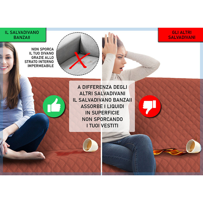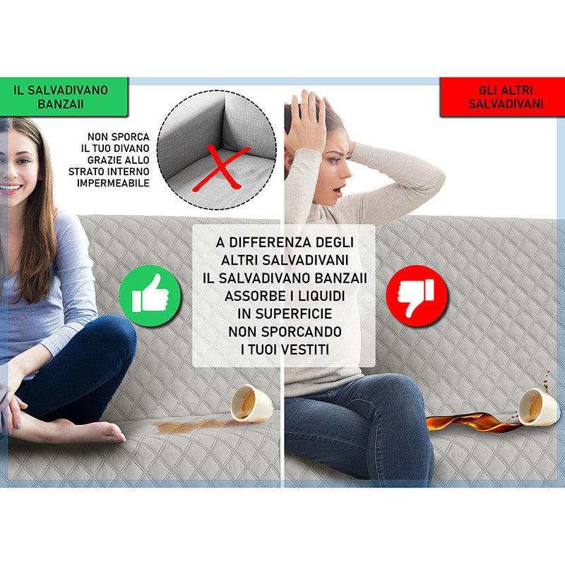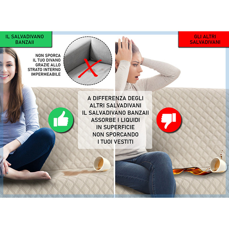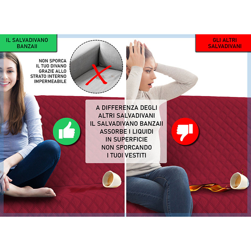 Copridivano trapuntato, imbottito con struttura innovativa che lo rende impermeabile. Questo salvadivano è stato ideato appositamente per essere impermeabile e per trattenere i liquidi, grazie alla sua costruzione a 5 strati. Non imbatterai più nel pericolo di macchiare o bagnare il tuo divano, grazie al rivoluzionario copridivano impermeabile Banzaii che assorbe i liquidi ed evita la loro dispersione. Prodotto particolarmente adatto anche a chi possiede animali domestici e a famiglie con bambini piccoli.
