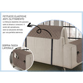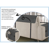 La seconda particolarità di questo prodotto sta nel metodo di fissaggio. Niente più fastidiosi spostamenti del copridivano grazie alle due cinghie posteriori, regolabili e verticali che mantengono il salvadivano fisso, rimanendo poco visibili. Sono interamente coperti anche seduta e braccioli del divano. Il copridivano è reversibile, quindi adatto sia a divani con penisola a destra che a divani con penisola a sinistra, e dotato di doppia tasca laterale porta-oggetti.