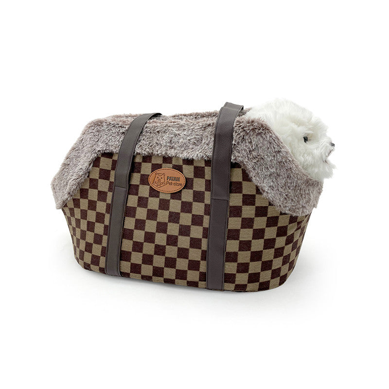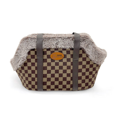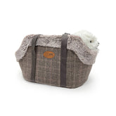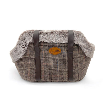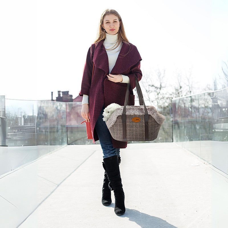 La borsa-trasportino è realizzata in un tessuto simil lana, con bordo superiore in tessuto peluche e pareti interne in pile, per tenere al caldo il tuo animale domestico durante gli spostamenti.