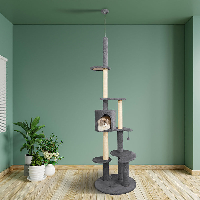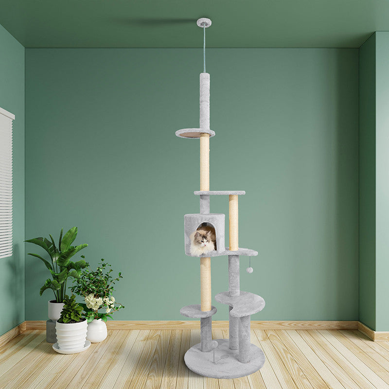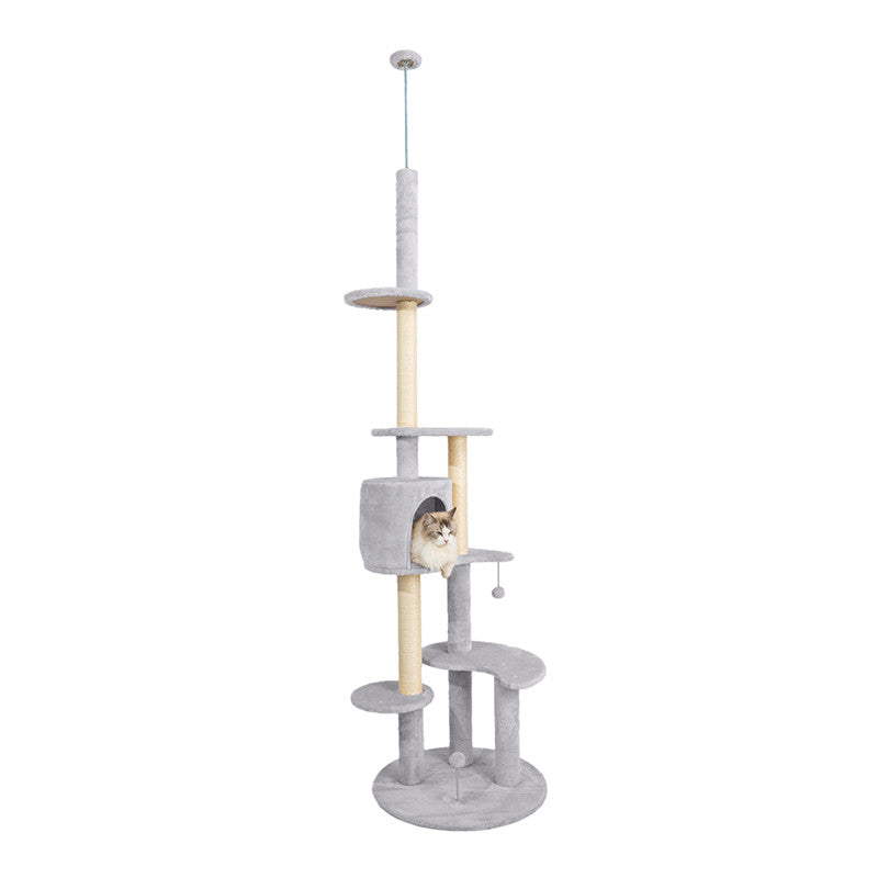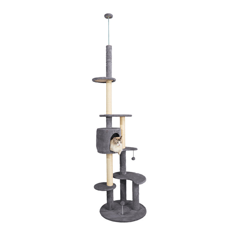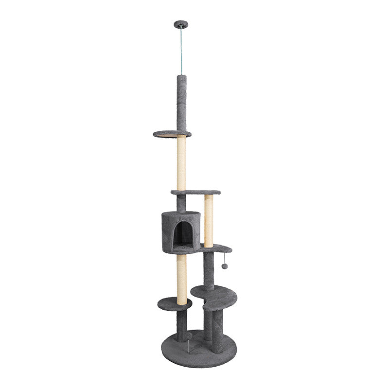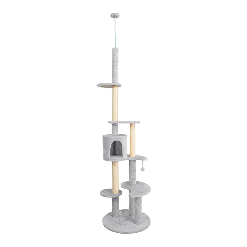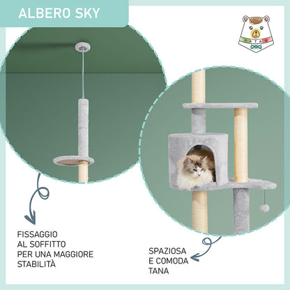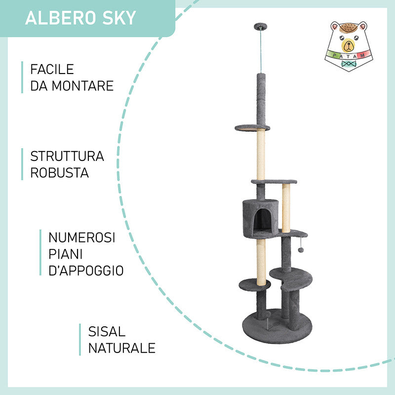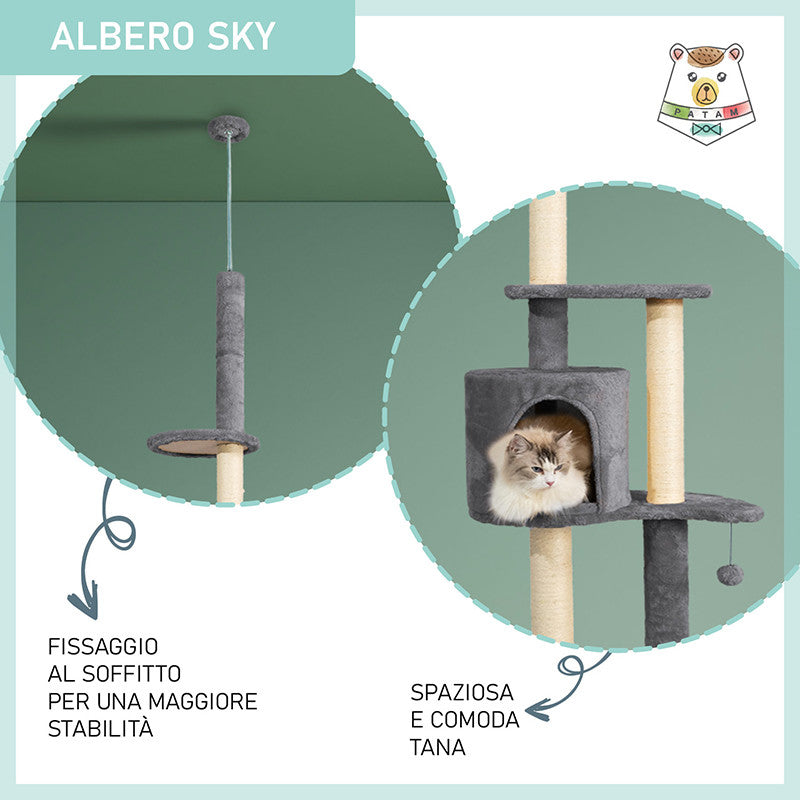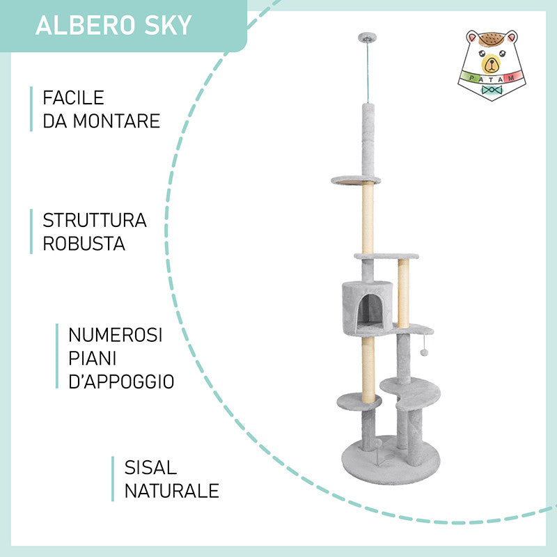 Albero tiragraffi in sisal a più livelli Sky. La particolarità di questo albero tiragraffi è la sua altezza regolabile, infatti va dal pavimento fino al soffitto, a cui può essere agganciato con un componente in acciaio. E’ composto da 3 pali tiragraffi e 4 piattaforme imbottite per riposo. Inoltre, è costituito da una grotta-casetta cilindrica (30x30x28 cm) con apertura ad arco e vari giochi (una pallina pendente e una pallina con molla).