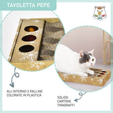Tavoletta tiragraffi interattiva in cartone Pepe con bordo con disegni e superficie in carta ondulata. All’interno della tavoletta sono presenti anche due palline-sonaglietti colorate per attirare e intrattenere il gatto.