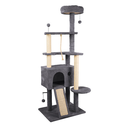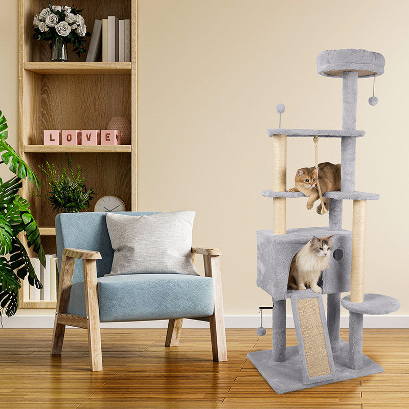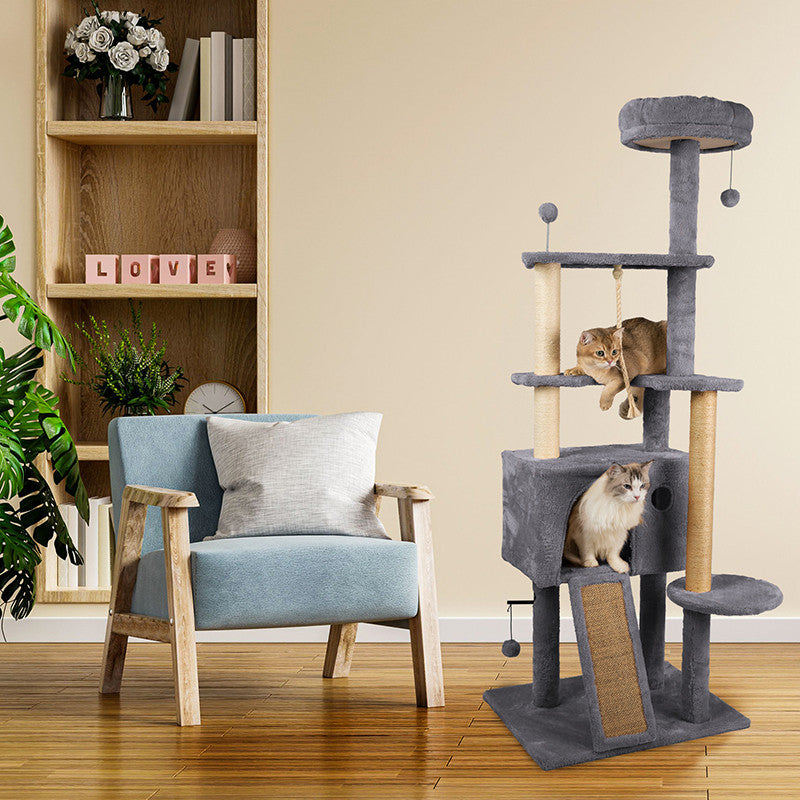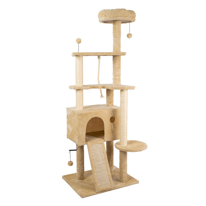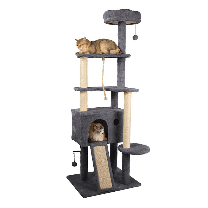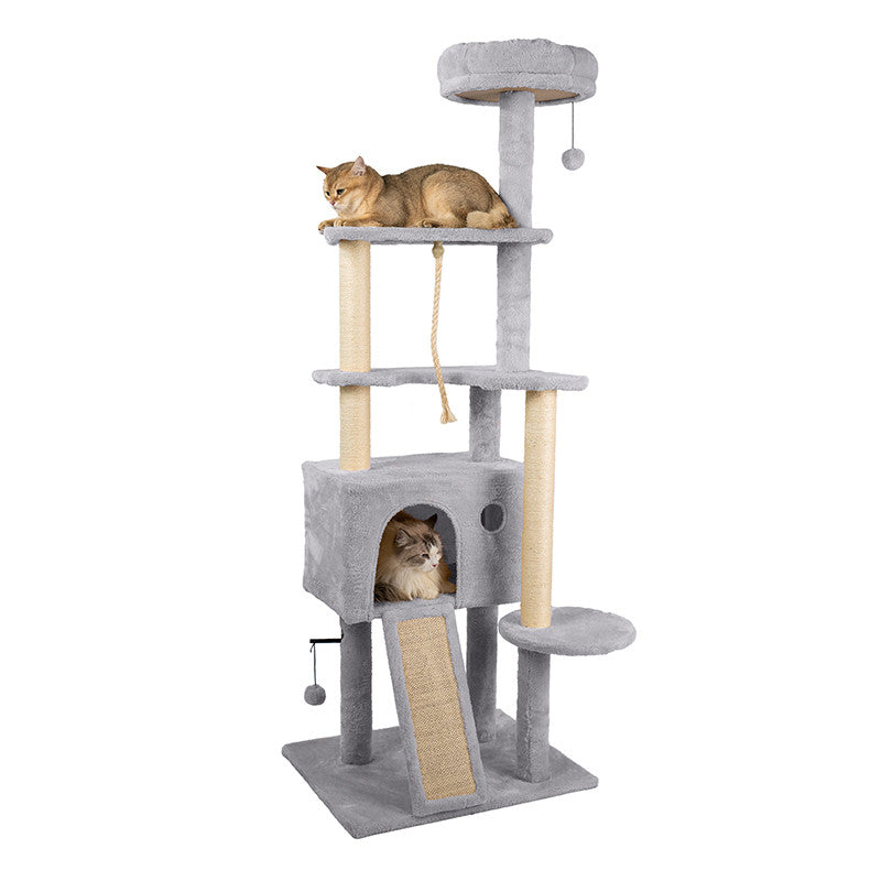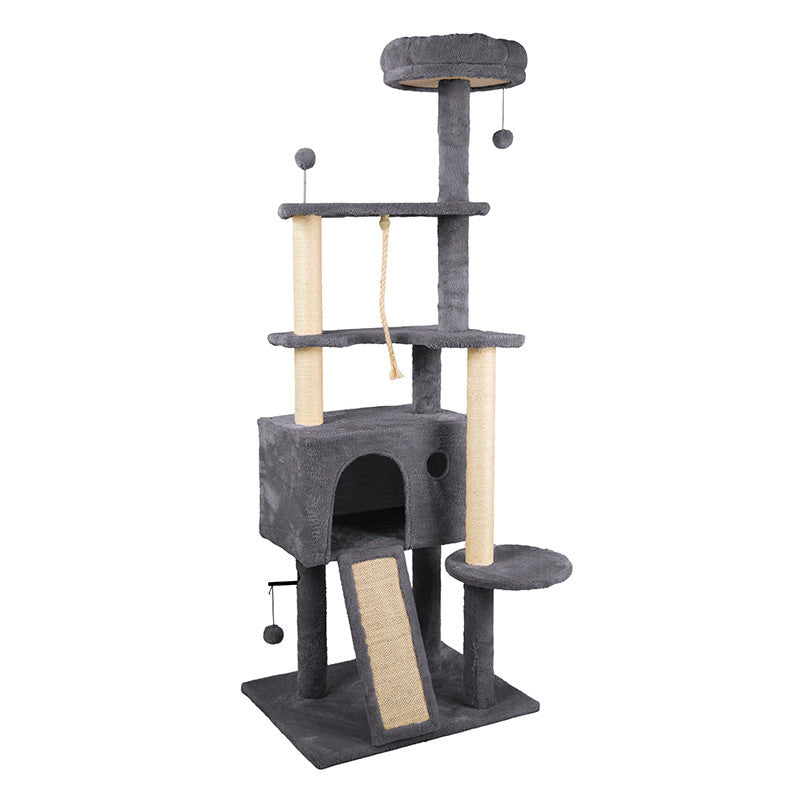 Inoltre, è costituito da una grotta-casetta rettangolare (48x30x30 cm) con apertura ad arco e piccolo oblò, vari giochi (2 palline pendenti, una pallina con molla e una cordina per gioco) e una rampa graffiatoio.