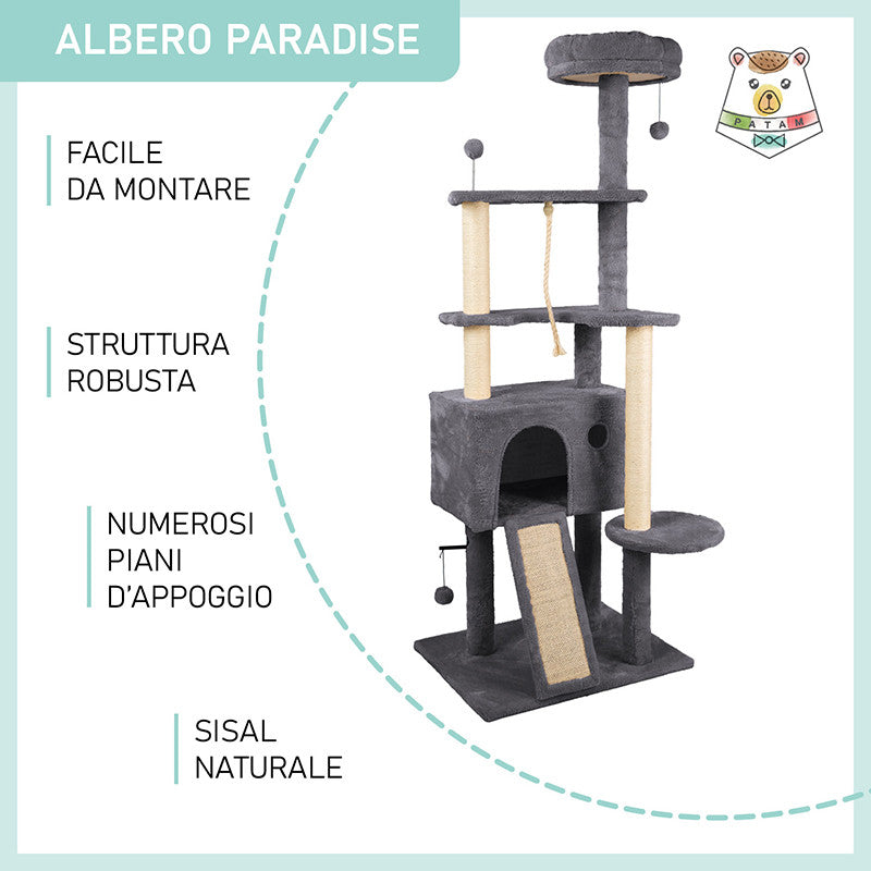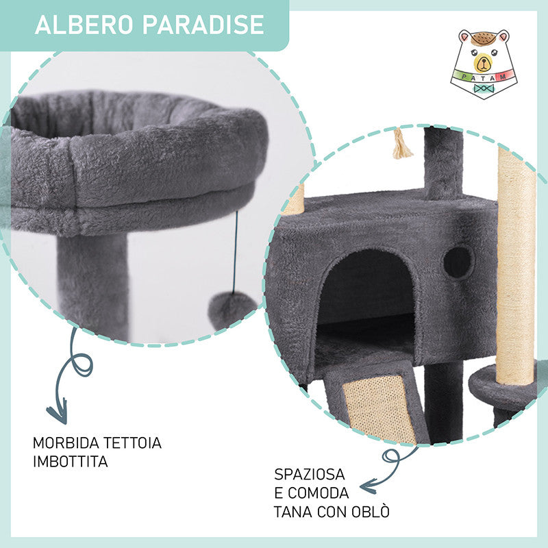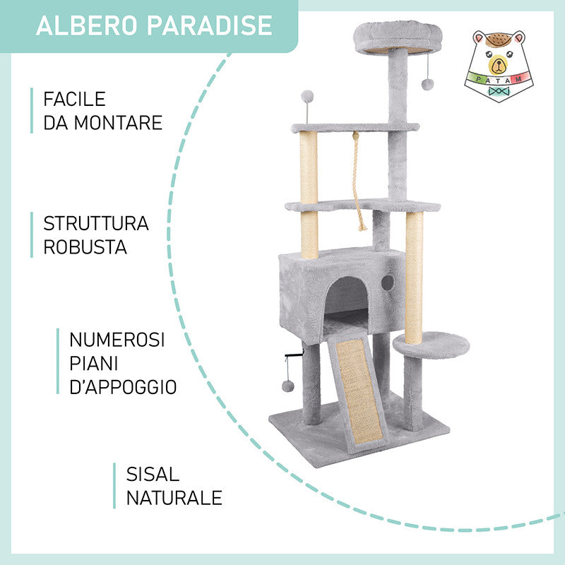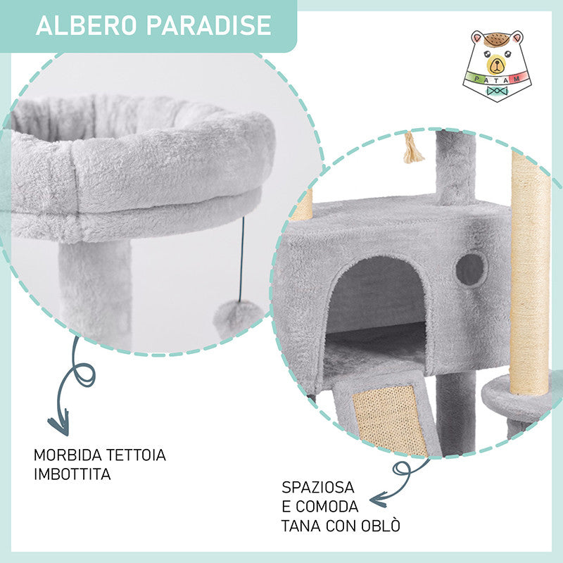Albero tiragraffi in sisal a più livelli Paradise, composto da 3 pali tiragraffi, una tettoia panoramica con bordo poggia-testa e due ulteriori piattaforme imbottite per riposo.