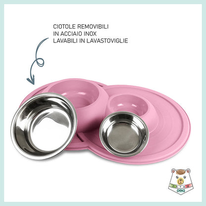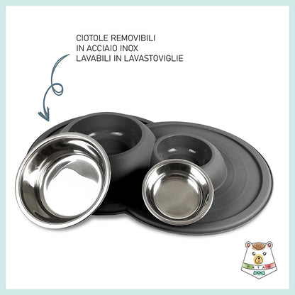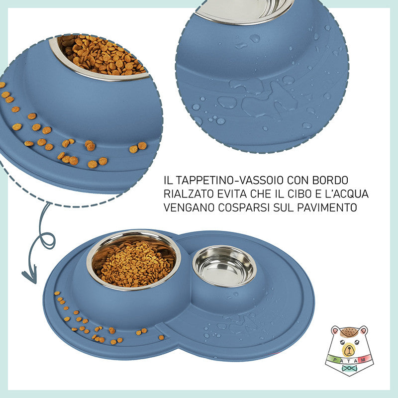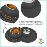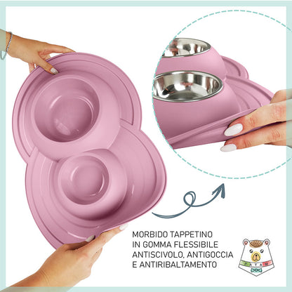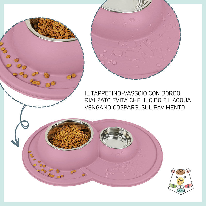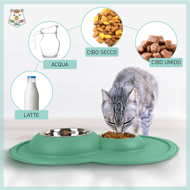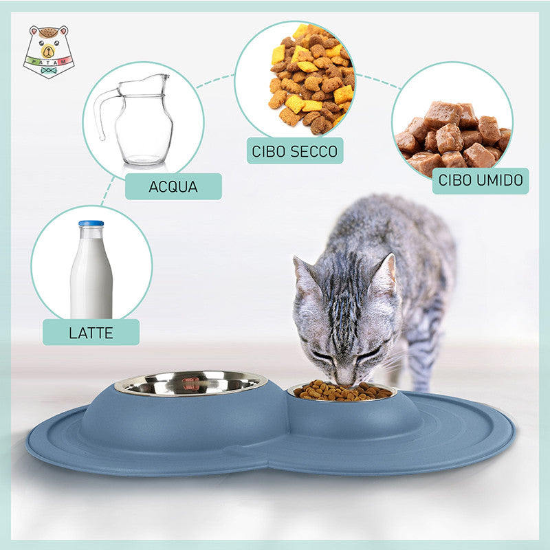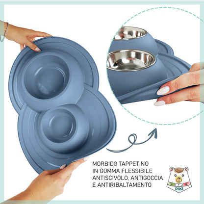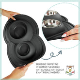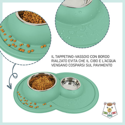 Ciotola doppia per cani e gatti in acciaio inossidabile dotata di morbido tappetino integrato antiscivolo, antigoccia e antiribaltamento.