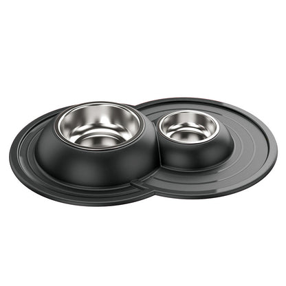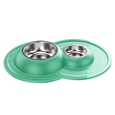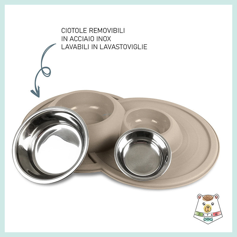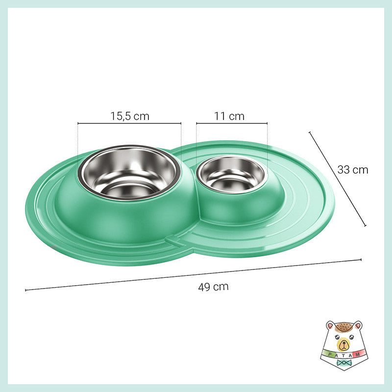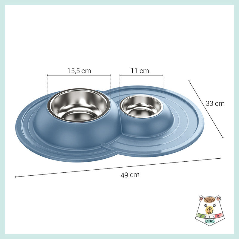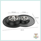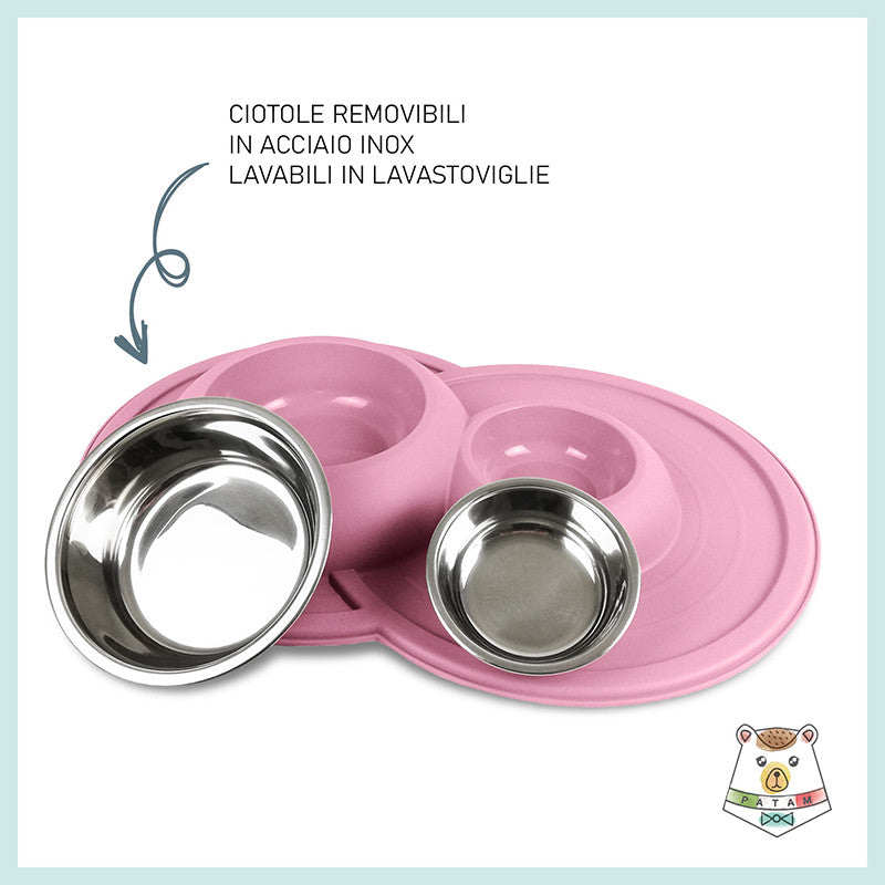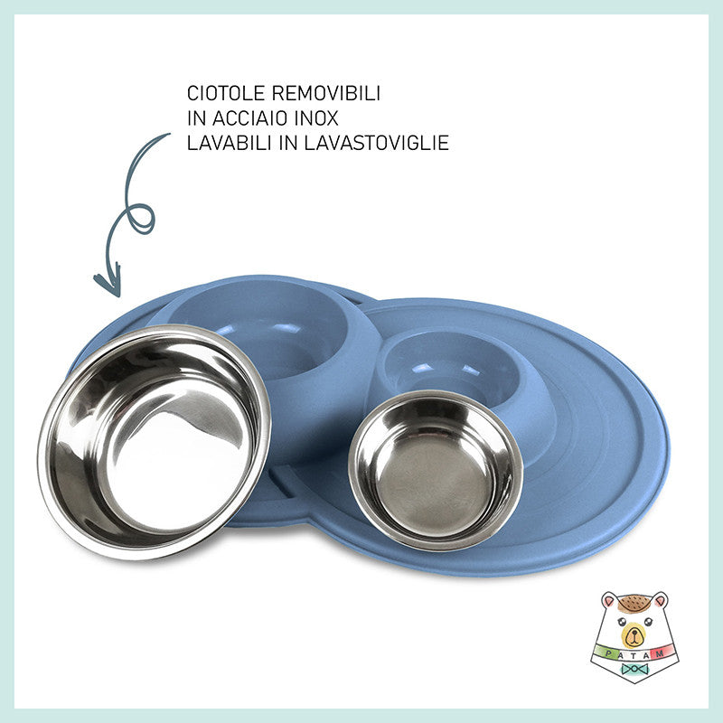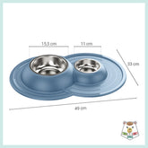 Ciotola doppia per cani e gatti in acciaio inossidabile dotata di morbido tappetino integrato antiscivolo, antigoccia e antiribaltamento.