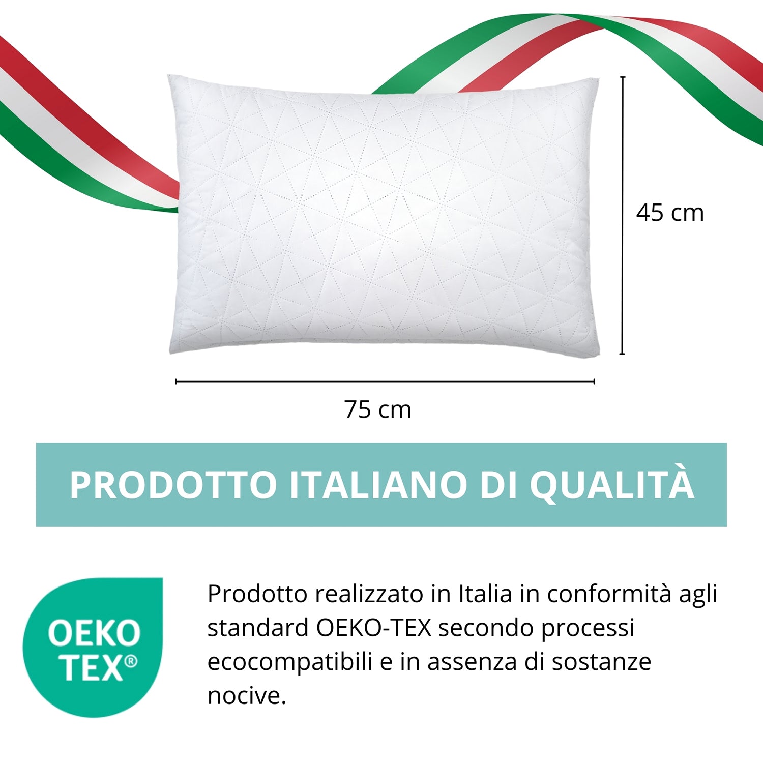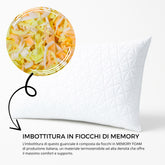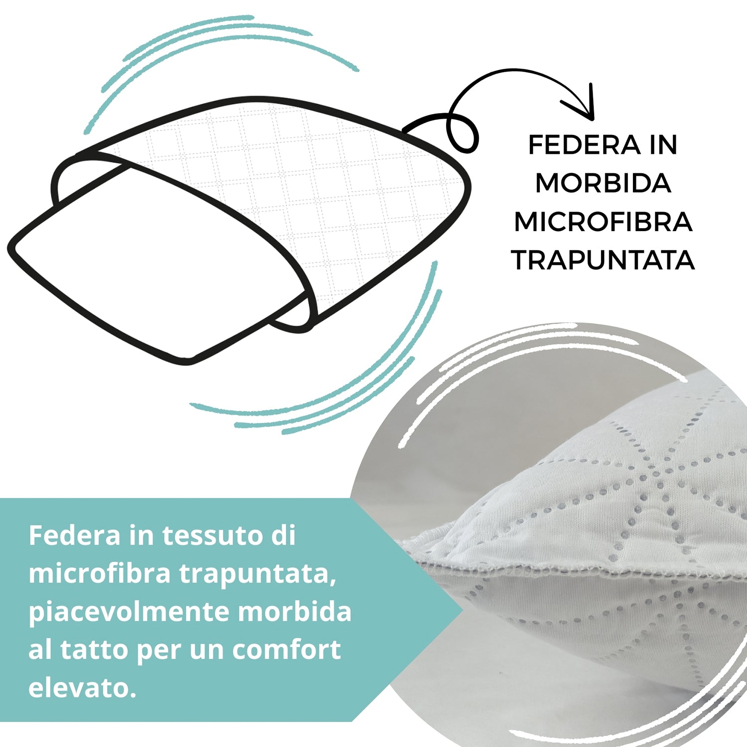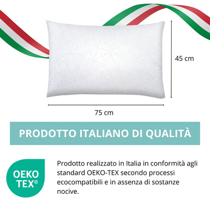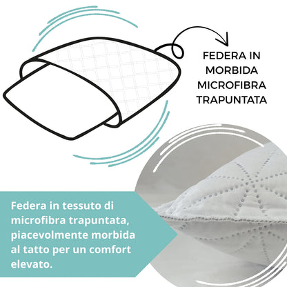 La fodera in microfibra trapuntata dona al tatto una piacevole morbidezza, aumentando il comfort e rendendo il cuscino raffinato e accogliente. Ogni guanciale è realizzato con materiali anallergici, antiacaro e certificati Oeko-Tex Standard 100, per garantire sicurezza e qualità nel tempo.