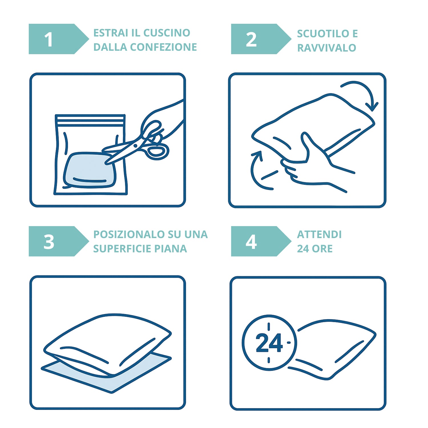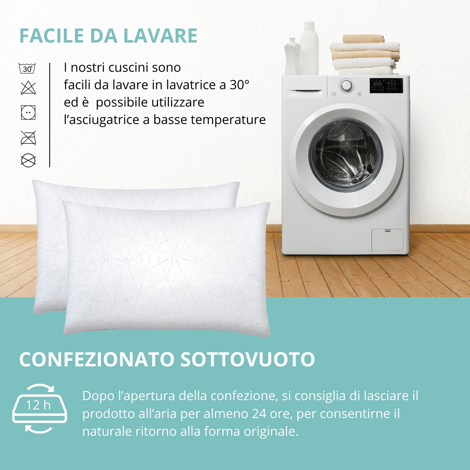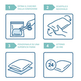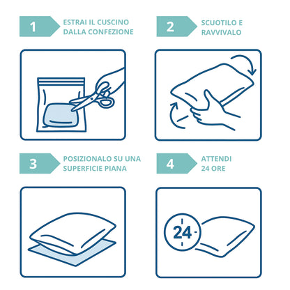 Facili da mantenere, i cuscini vengono consegnati sottovuoto: è sufficiente estrarli, scuoterli, lasciarli riposare su una superficie piana per 24 ore e saranno pronti all’uso.