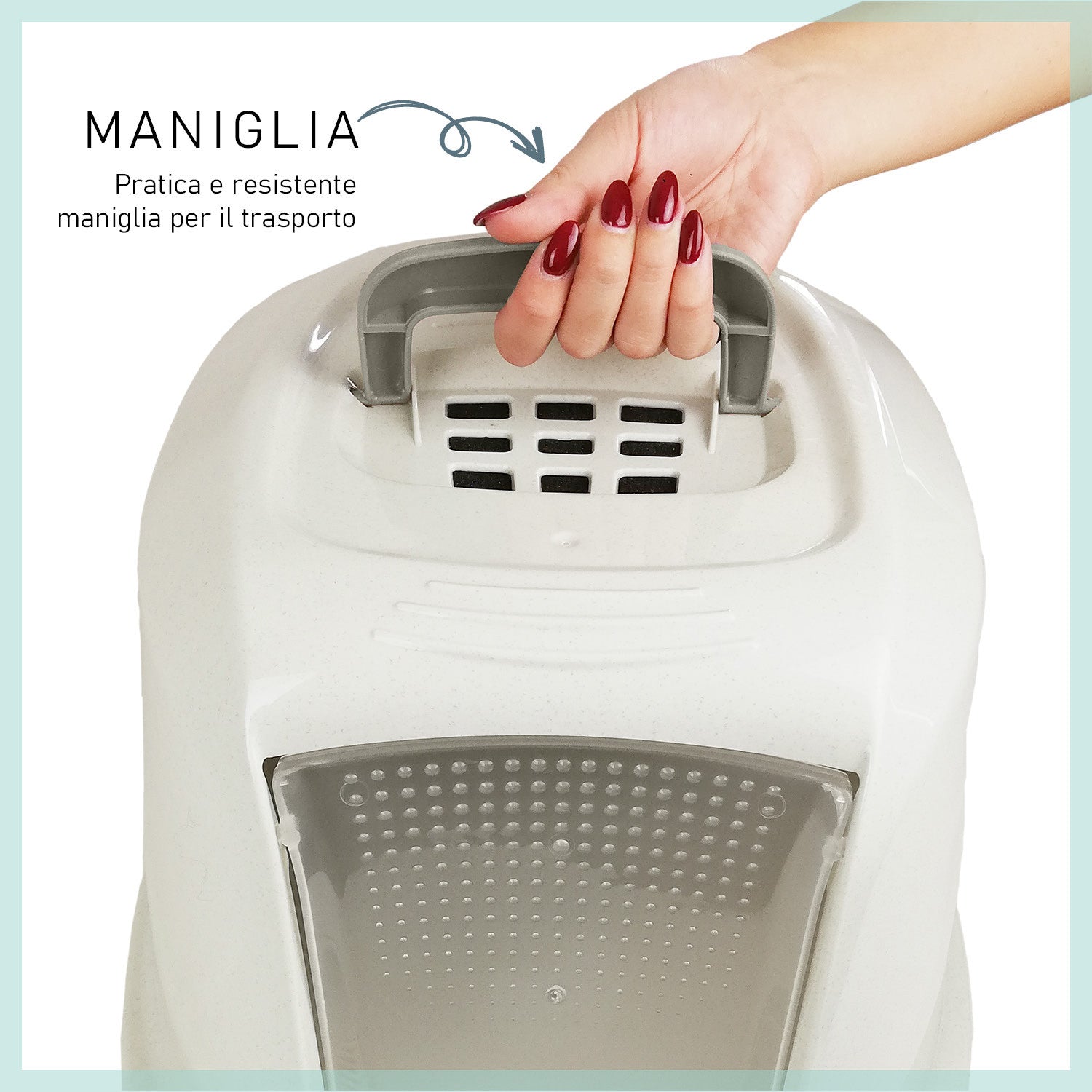 La lettiera è dotata di maniglia ed è in plastica dura, quindi facilmente lavabile ed assemblabile. I ganci laterali con comoda e sicura chiusura a clic consentono una facile apertura e pulizia della toilette.