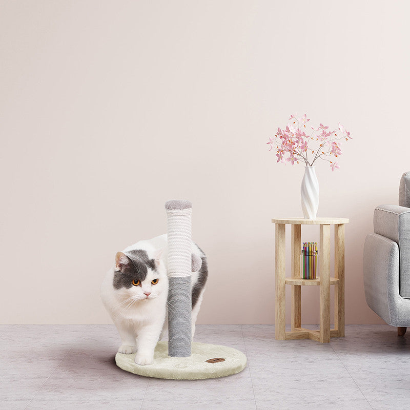 Palo tiragraffi in sisal bicolor Pallina, composto da base circolare rivestita da morbido peluche e pallina pendente per gioco. Ottimo per chi non dispone di molto spazio in casa; funge infatti da tiragraffi e da gioco, grazie alla pallina che attira l’attenzione del gatto.