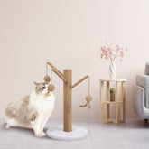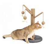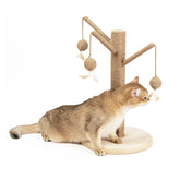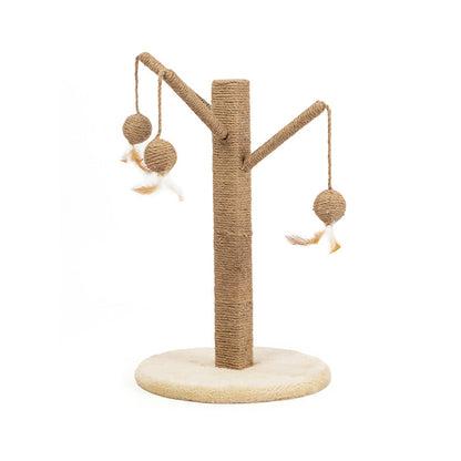 Palo tiragraffi in sisal Happy Tree, composto da base tonda rivestita da morbido peluche e tre bastoncini in sisal, ciascuno con pallina e piuma per gioco. Ottimo per chi non dispone di molto spazio in casa funge infatti da tiragraffi e da gioco, grazie alle palline che attirano l’attenzione del gatto.