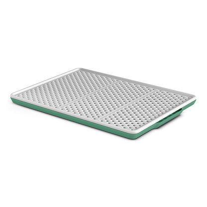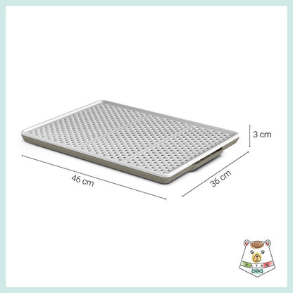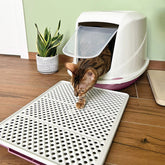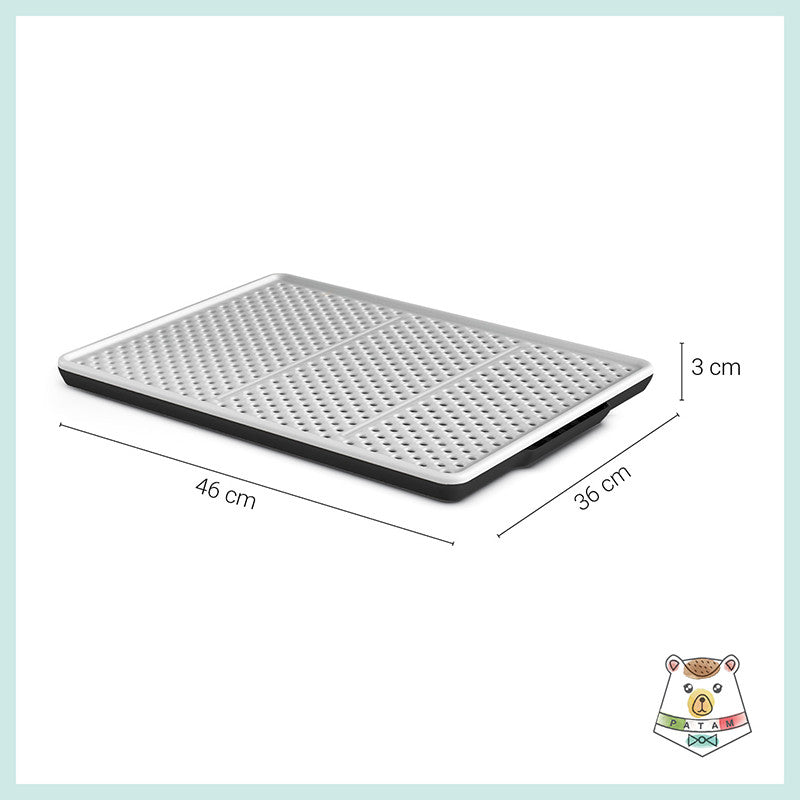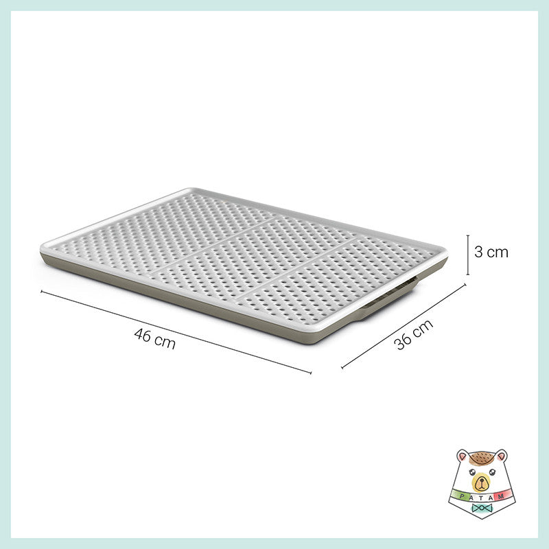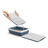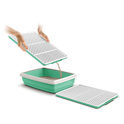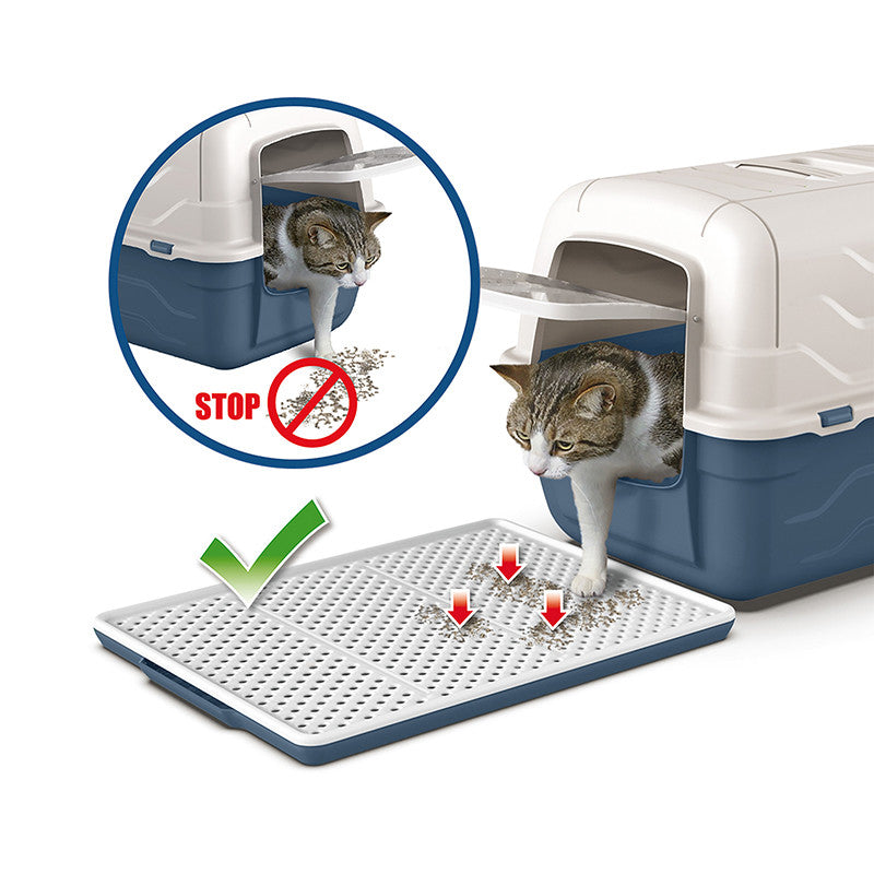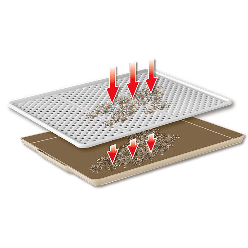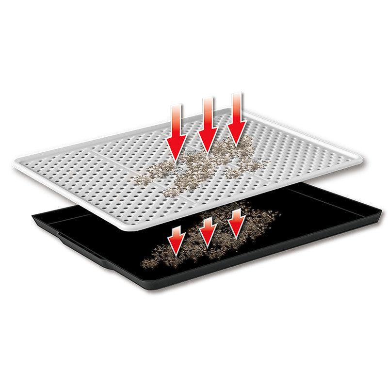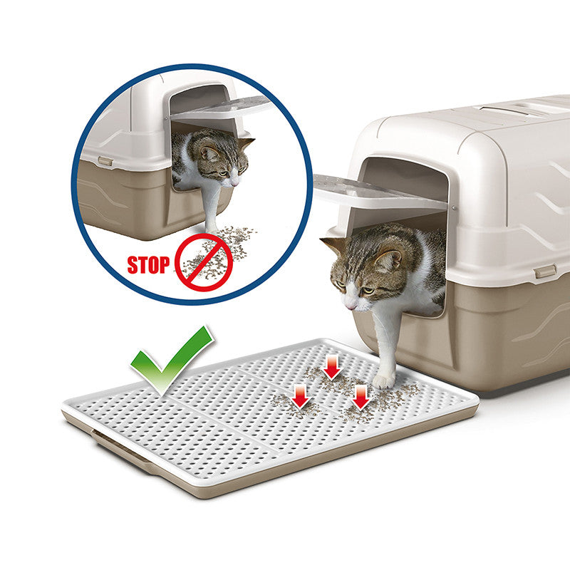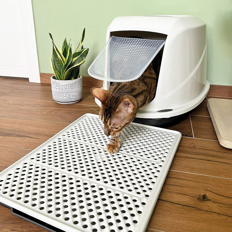Tappeto rigido salvasporco per lettiere e toilette per gatti. Il tappeto è costituito da due parti e funge da setaccio. I granelli della sabbietta infatti attraversano i fori presenti nello strato superiore del tappeto e si depositano sul fondo, evitando che la sabbia venga cosparsa sul pavimento quando il gatto esce dalla lettiera.