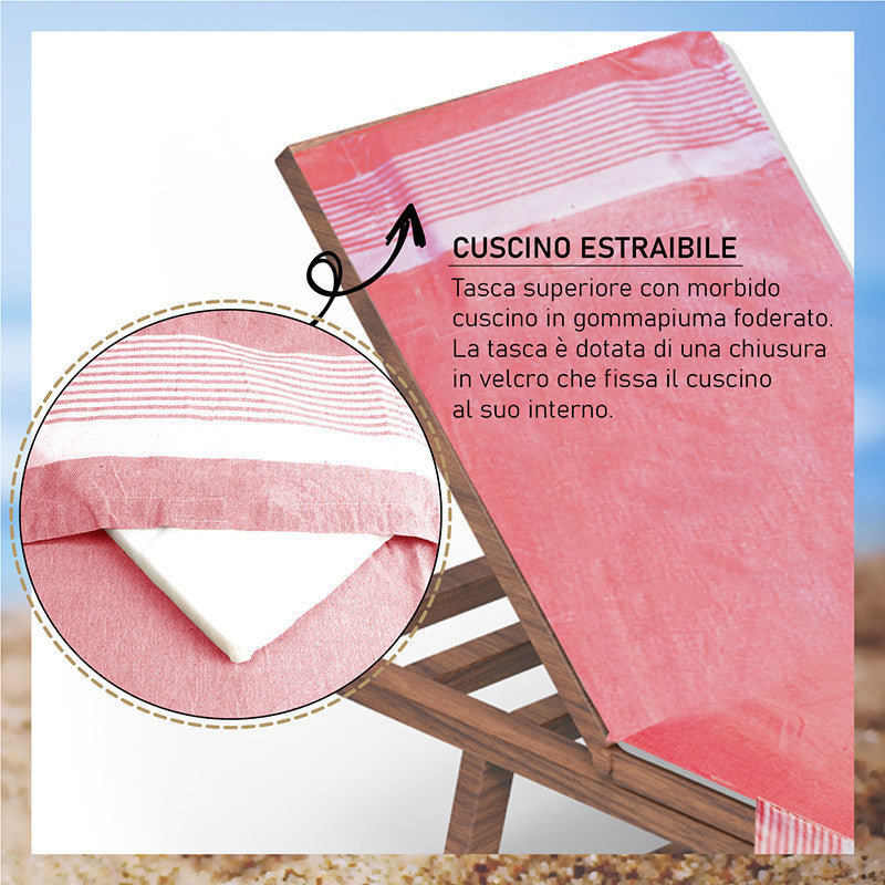 Telo mare ideato appositamente per sdraio e lettino, dotato di cuscino in gommapiuma, foderato e removibile con chiusura in velcro e di pratiche tasche laterali, con cucitura divisoria, in cui riporre facilmente gli oggetti al mare o in piscina, tenendoli sempre a portata di mano.