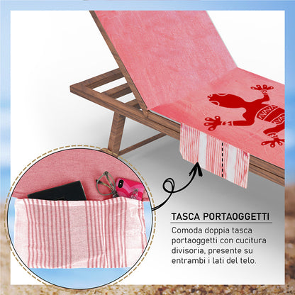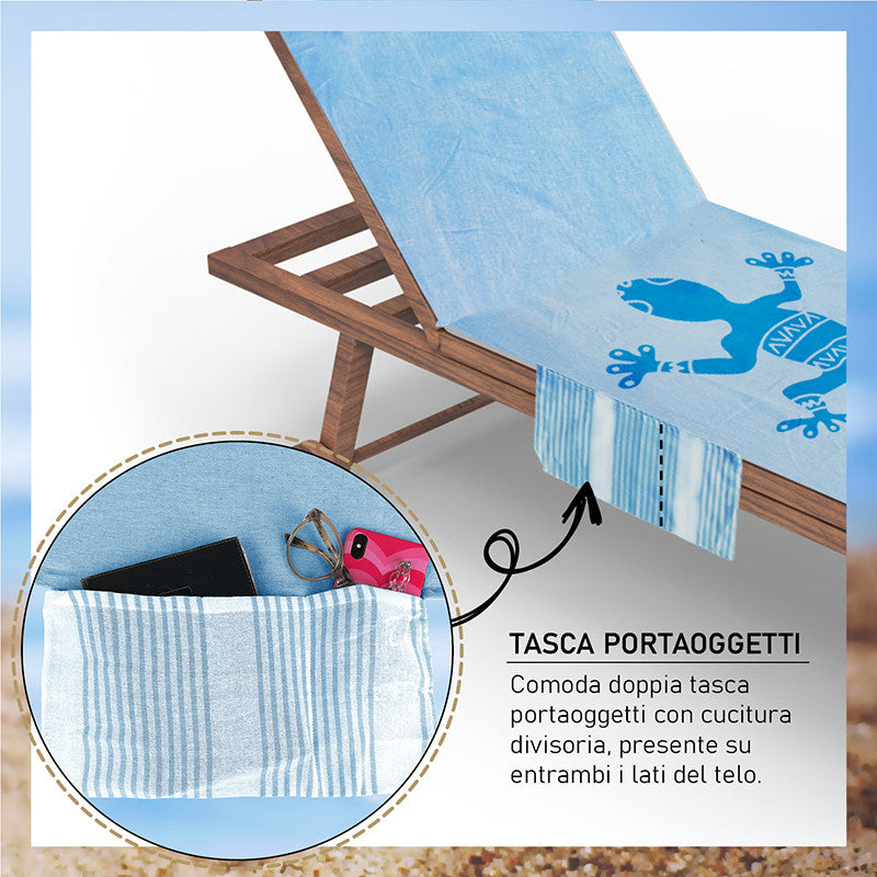 Telo mare ideato appositamente per sdraio e lettino, dotato di cuscino in gommapiuma, foderato e removibile con chiusura in velcro e di pratiche tasche laterali, con cucitura divisoria, in cui riporre facilmente gli oggetti al mare o in piscina, tenendoli sempre a portata di mano.