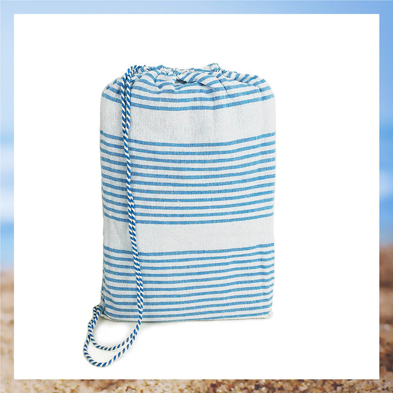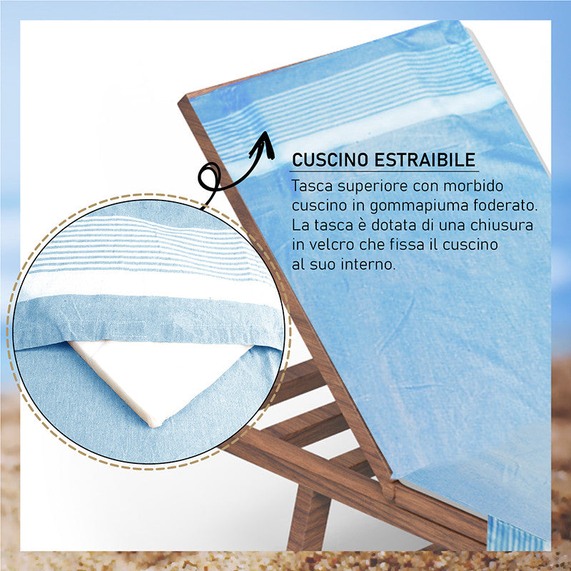 Telo mare ideato appositamente per sdraio e lettino, dotato di cuscino in gommapiuma, foderato e removibile con chiusura in velcro e di pratiche tasche laterali, con cucitura divisoria, in cui riporre facilmente gli oggetti al mare o in piscina, tenendoli sempre a portata di mano.