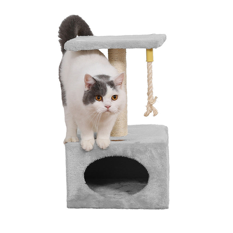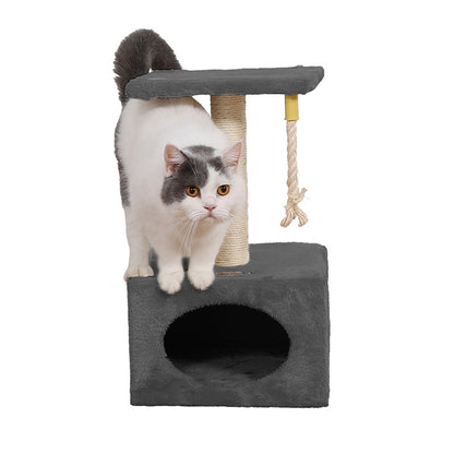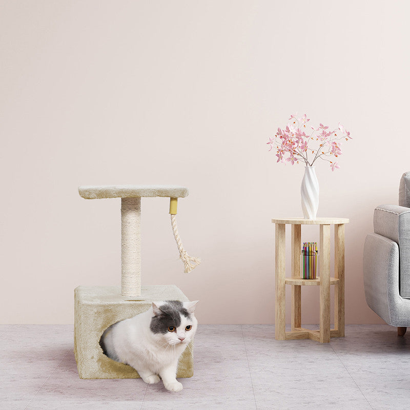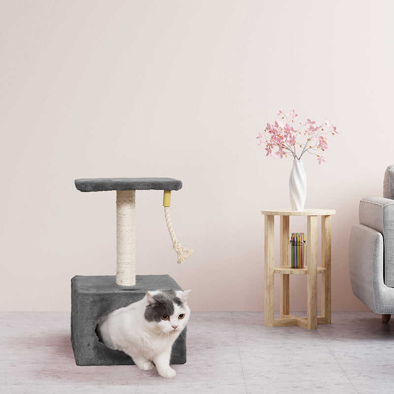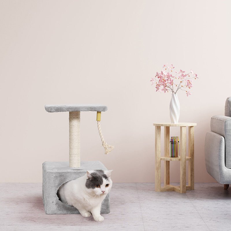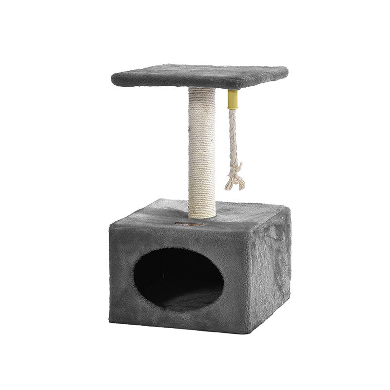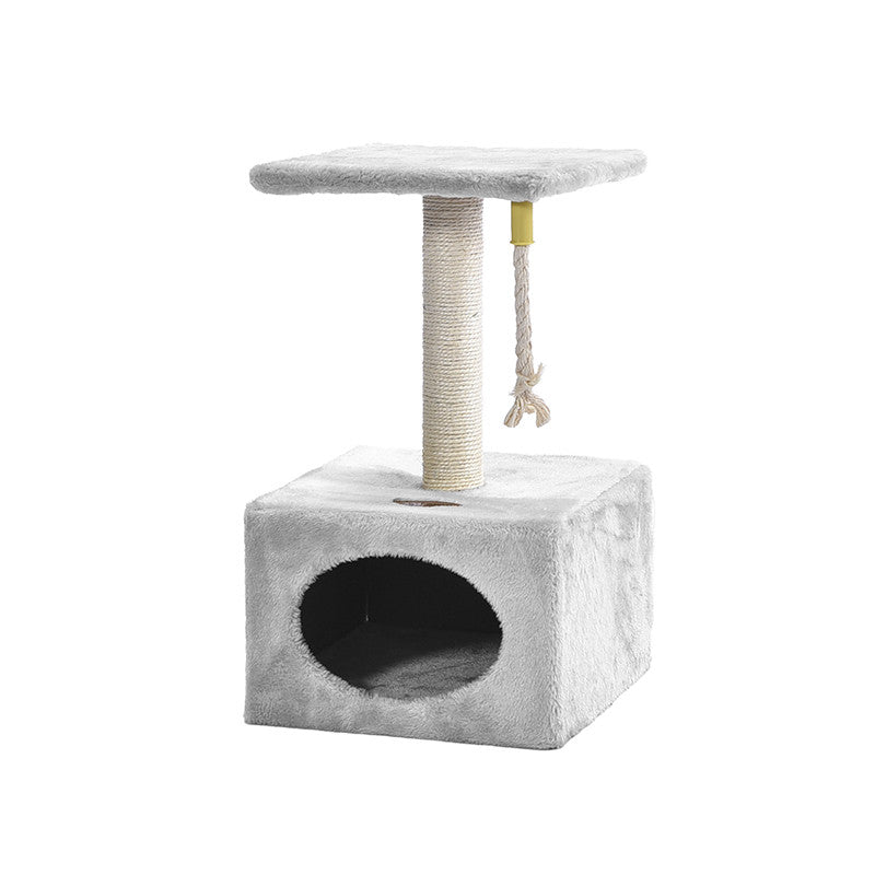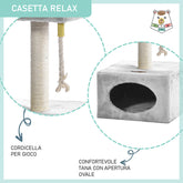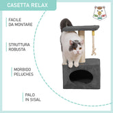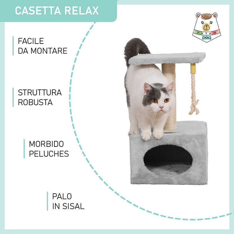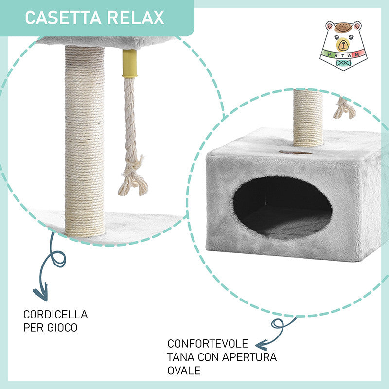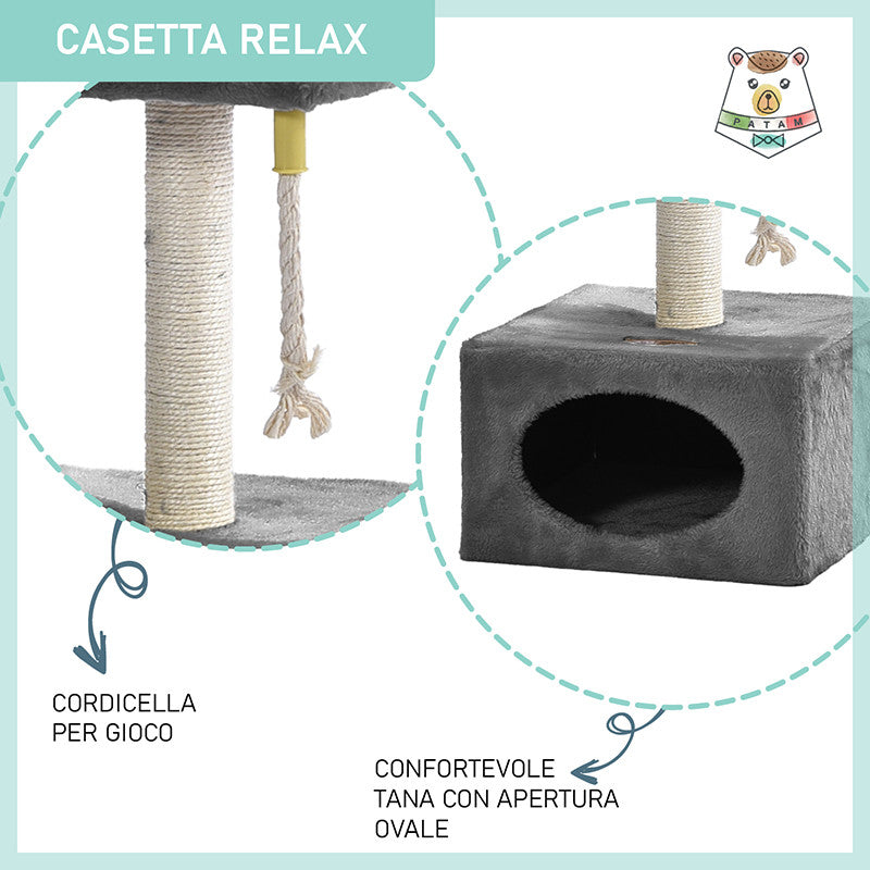 Tiragraffi in sisal a più livelli Relax, composto da un palo tiragraffi, una tettoia panoramica e una grotta-casetta rettangolare (31x31x20 cm) con apertura ovale e una cordina pendente per gioco. La particolarità di questo tiragraffi è la sua compattezza, infatti funge sia da tiragraffi per gioco che da cuccia per riposo.