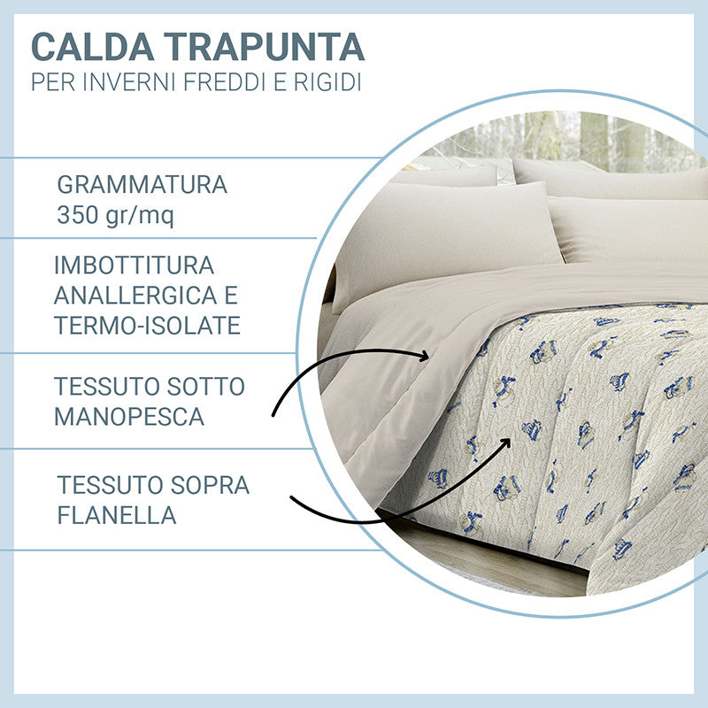 Trapunta invernale realizzata in un tessuto di morbida e calda flanella, con retro manopesca, interamente ideata e realizzata in Italia. L’imbottitura in ecopiuma anallergica e termoisolante da 350 gr/mq la rende il prodotto ideale per gli inverni più rigidi e freddi.