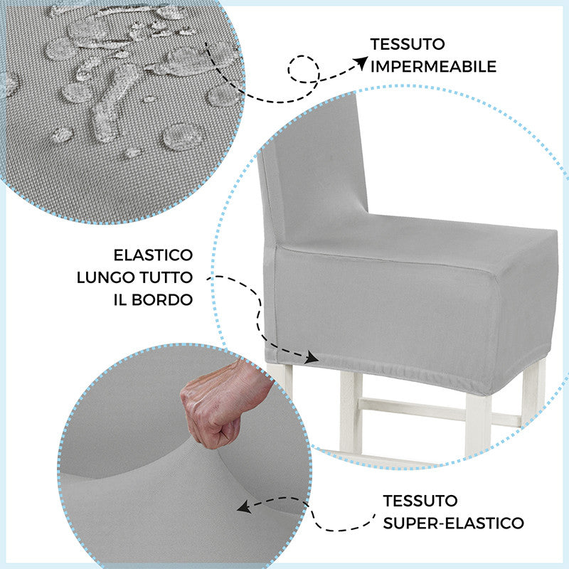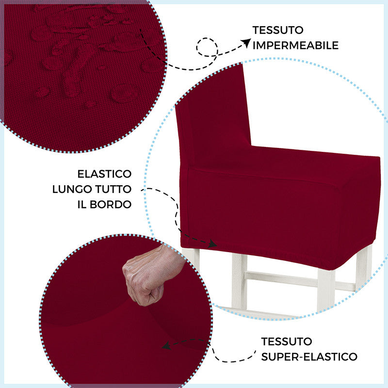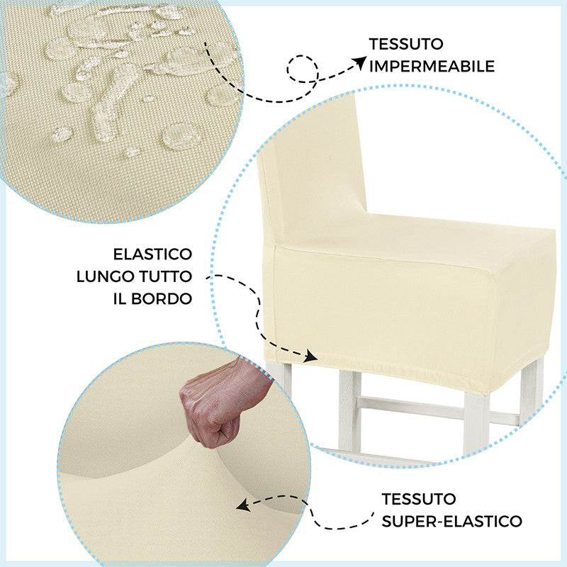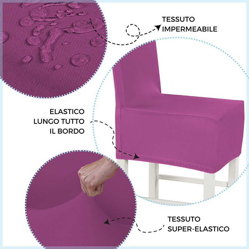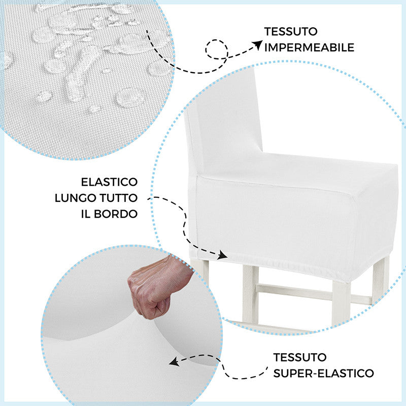 Adatto a tutte le sedie con altezza dello schienale da 40 a 60cm e seduta da 35 a 50 cm sia in larghezza che in profondità. Grazie al trattamento ANTIMACCHIA la tua sedia sarà protetta da schizzi di cibo e bevande, mentre grazie alla particolare composizione SUPERELASTICA del tessuto vestirai le tue sedie con facilità ed eleganza.